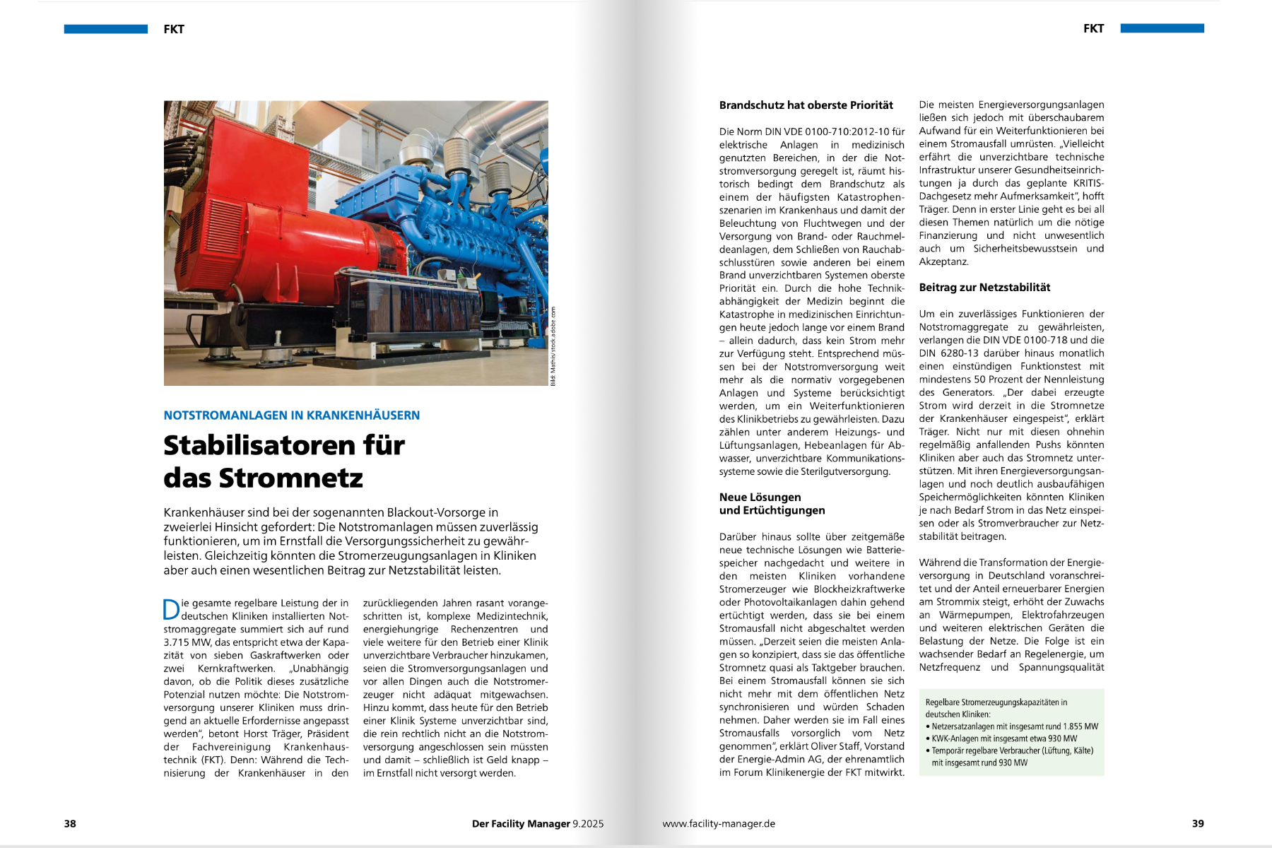 Die Fachvereinigung Krankenhaustechnik fordert die Politik, Netzbetreiber und die Energiewirtschaft auf, diese Ressourcen nicht länger zu ignorieren, sondern partnerschaftlich zu nutzen – für ein stabiles, nachhaltiges und resilientes Stromsystem.