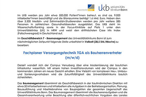 Im Baumanagement des Universitätsklinikums Bonn wird zum nächstmöglichen Zeitpunkt ein Fachplaner Versorgungstechnik TGA als Bauherrenvertreter (m/w/d) in Vollzeit gesucht.